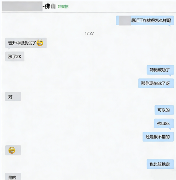 佛山小姐姐成功转岗测试,涨薪2k 2025-12-31 17:41 0 0 小姐姐大专学历,转行测试进击之路 报名系统学习软测,成功内部转岗 直接晋升中级测试,涨薪2k,月入8k 学历不是限制,技术才是硬底气 评论:0 点赞:0 阅读: +1