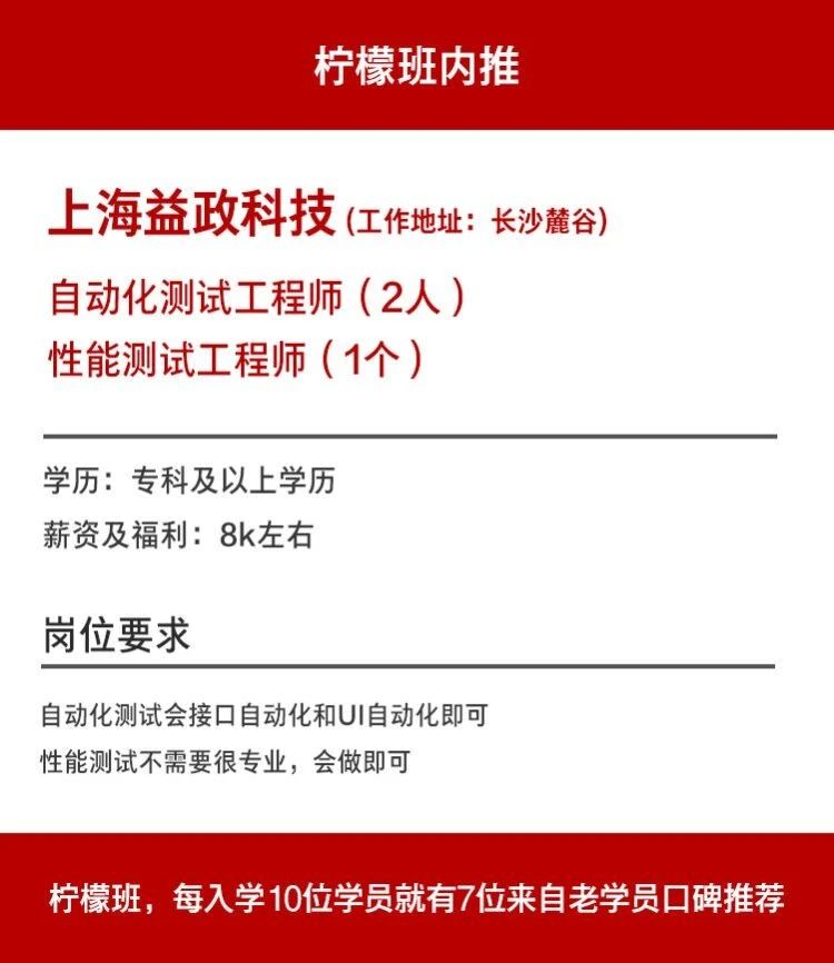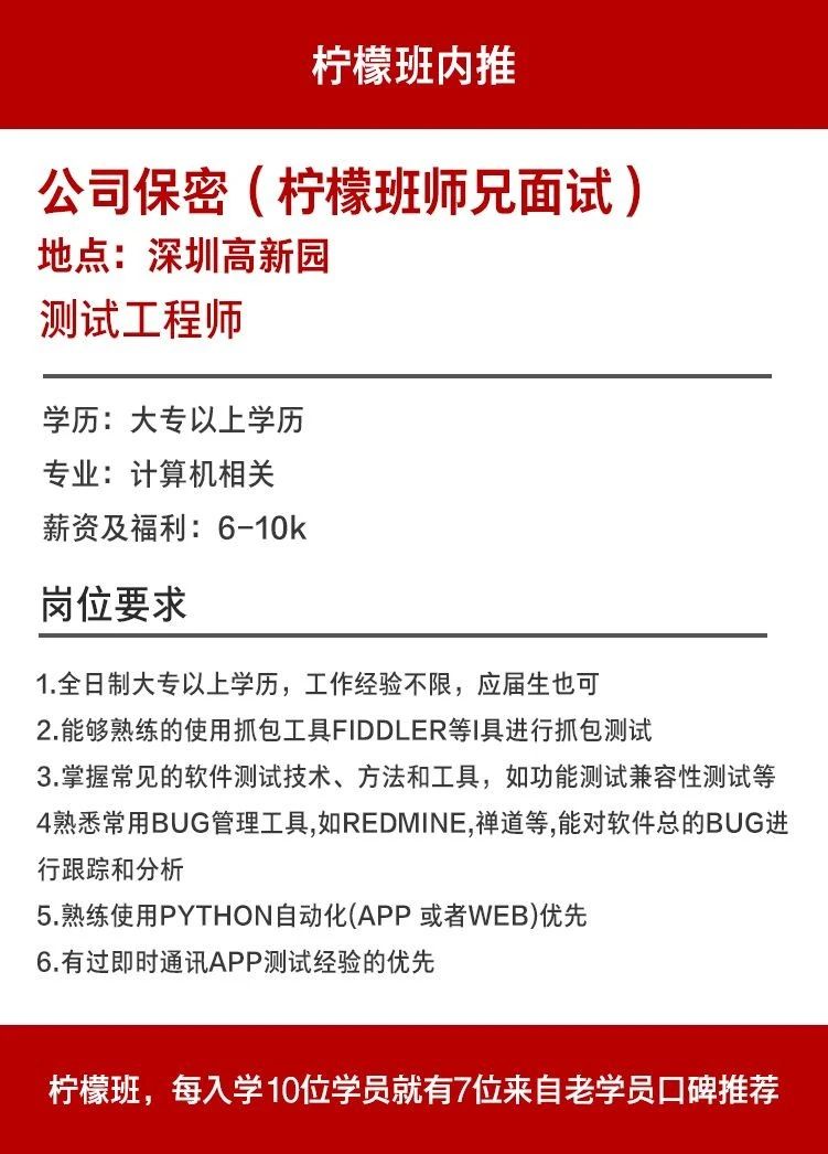 【急招】3个内推!测试工程师,大专以上学历,柠檬班师兄面试哦