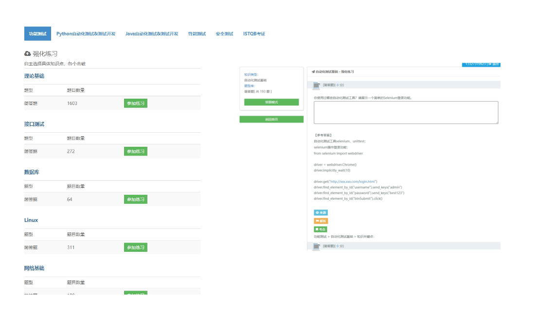 目前题库囊括了软件测试大部分岗位的相关面试题:功能测试面试题、自动化测试面试题、测试开发面试题、性能测试、测试管理面试题、大数据测试面试题、安全测试面试题、测试考证istqb面试题。
